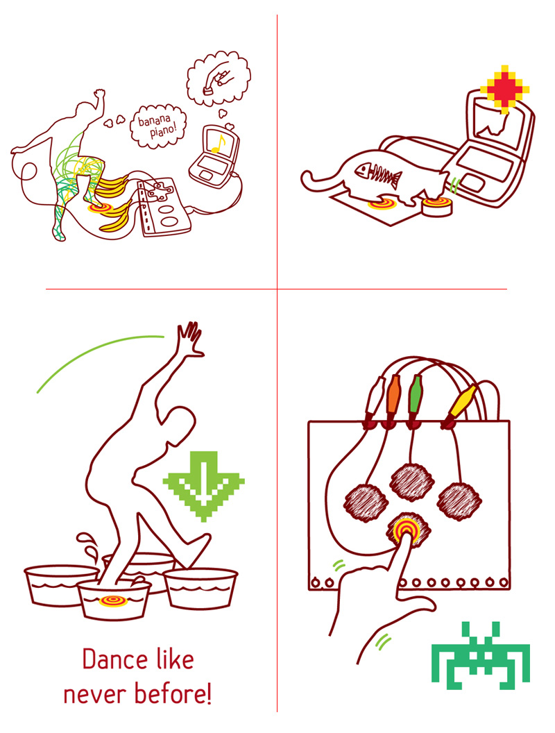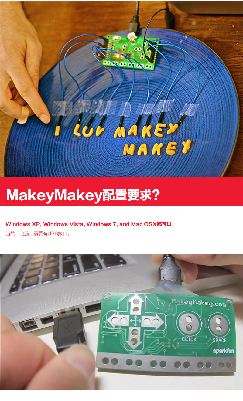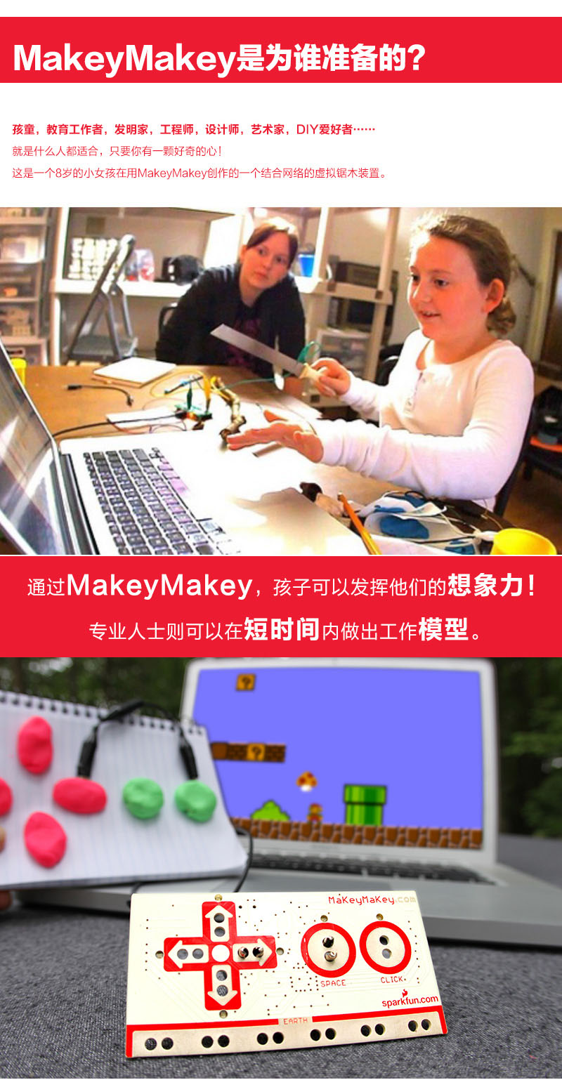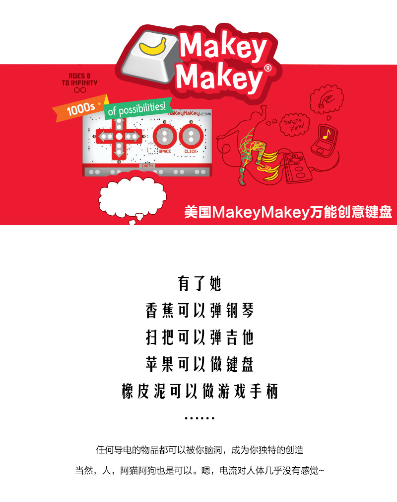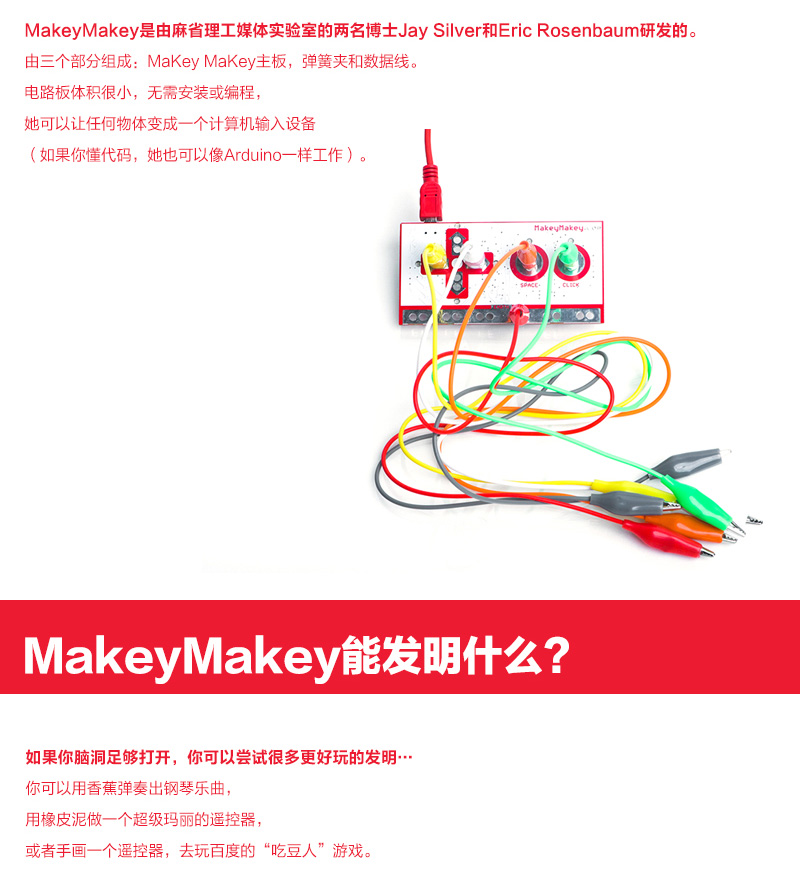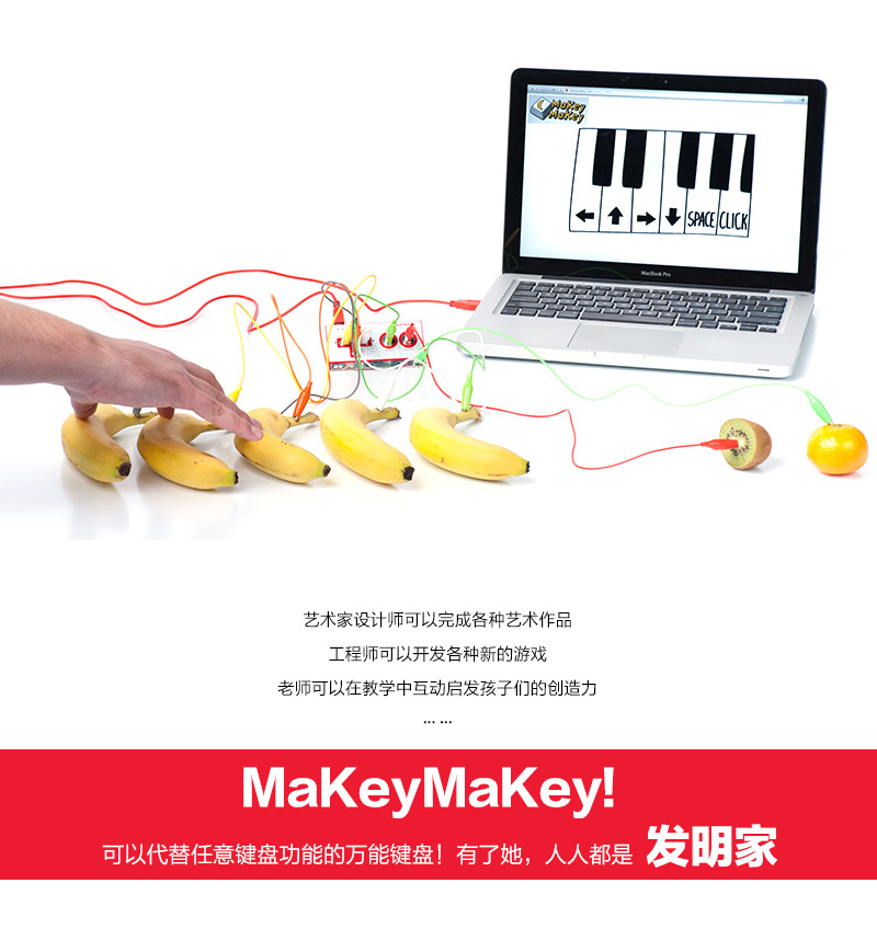 Makey Makey是21世紀的一項發(fā)明,該產(chǎn)品對于初學者和專家來說是一個簡單的套件工具,它結(jié)合互聯(lián)網(wǎng),可以使日常用品變成觸摸板,那么我們可以利用它做些什么呢?那就要看你的咯! 使用MaKey MaKey,僅僅用幾個鱷魚嘴彈簧夾連接到Makey Makey電路板上,比如你和一根香蕉。當你觸摸香蕉的時候,Makey Makey向你的電腦發(fā)送一個連接提示消息,而你的電腦會誤以為Makey Makey是一個鍵盤或鼠標,因此,它可以與任何程序或網(wǎng)頁一起工作,因為所有的程序和網(wǎng)頁都需要鍵盤或鼠標輸入。Make+Key=Makey Makey!